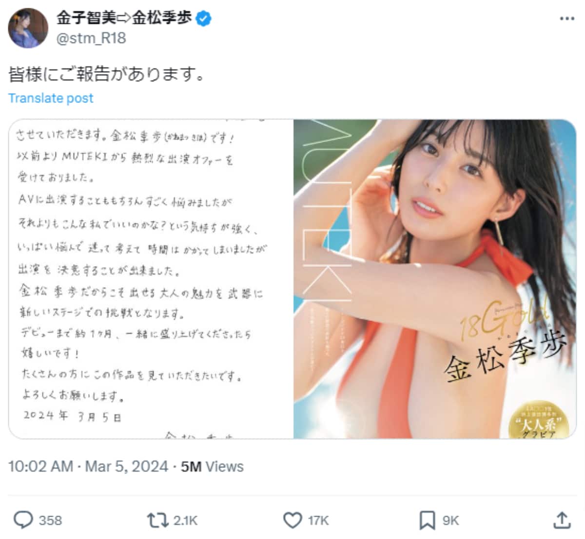 元グラドル金子智美、AVデビューを報告「いっぱい悩んで迷って考えて時間はかかった」(日刊スポーツ) - Yahoo!ニュース