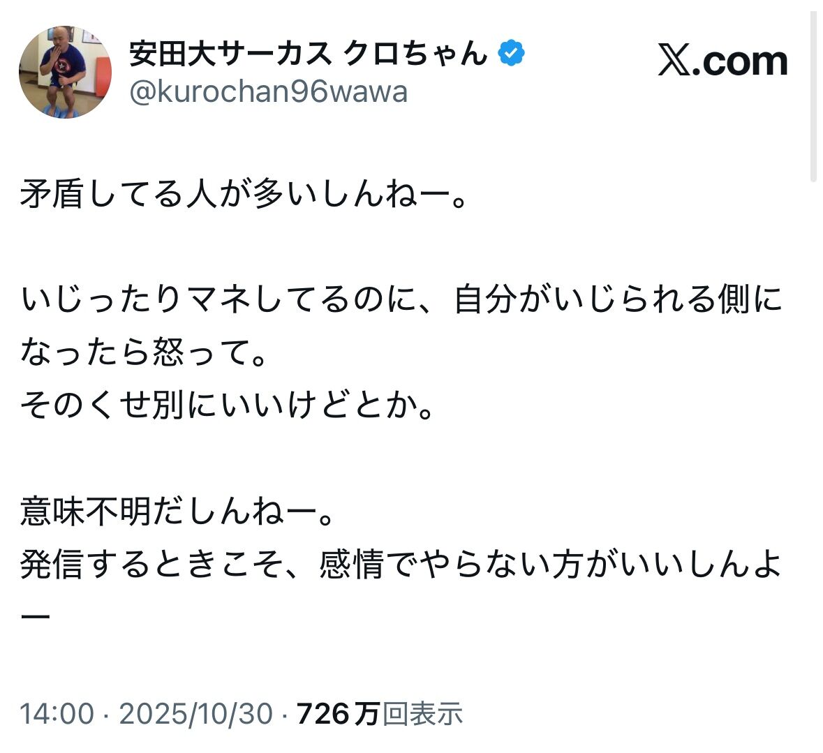 イジられキャラのクロちゃんの物申す系の投稿に、引用欄などではさまざまな声が飛び交っている。