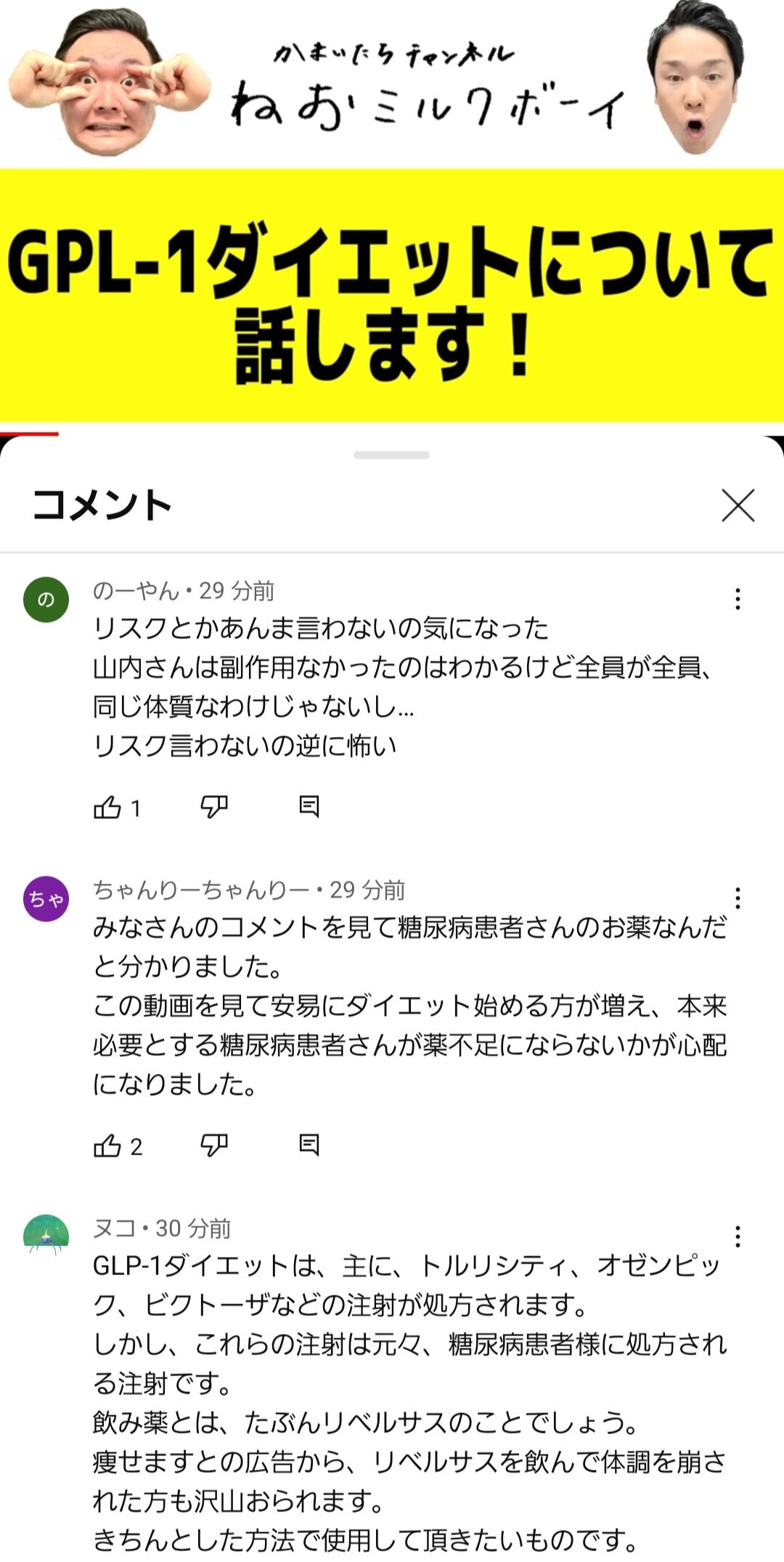 かまいたち山内、ダイエット目的で「糖尿病薬」使用を紹介 日医、国民生活センターなどは警鐘...動画非公開に [ひかり★] 2023年04月20日 カテゴリ:かまいたち芸人まとめ 1: ひかり ★ 2023/04/19(水) 03:39:19.57 ID:Nu9N/tol9 お笑いコンビ「かまいたち」の山内健司さん(42)が2023年4月16日、糖尿病治療薬を使ったダイエット方法をユーチューブで発信した。 「痩せないっていうのがないねんて」「ラーメン一杯食べたら、半分食べた計算になる」と驚くべき痩身効果があることを紹介していたが、18日夜までに動画は非公開となった。 ■「テレビ系に出ている人で言ってるの俺だけじゃない?」 動画は、「かまいたち山内がGLP-1ダイエットについて話します」とのタイトルで配信された。概要欄には「※あくまで今回の動画は山内個人の体験談・見解になります」と注意書きがある。 動画では山内さんが「GLP-1受容体作動薬」と呼ばれる2型糖尿病治療薬を使ってダイエットに挑み、約3か月で8キロ痩せたと成果を報告している。山内さんによれば、GLP-1ダイエットは「テレビ系に出ている人で言ってるの俺だけじゃない?」と市民権を得ているとは言えないものの、徐々に広まり始めている。 コンビでテレビCMに出演したクリニックでオンライン診療および注射、飲み薬の処方を受け、食欲減退を実感したという。さらに、「ラーメン一杯食べたら、半分食べた計算になる」と、口にした糖質の半分が尿で排出されると話す。 副作用については「めっちゃトイレが近くなります」と頻尿を挙げ、「痩せないっていうのがないねんて」「痩せるのは当然の事」とお墨付きを与えた。 詳細はクリニックのページを案内し、「俺は○○さんでやりました」「○○さんで人生が変わりました」(伏字は編集部、クリニック名が入る)と推奨した。相方の濱家隆一さん(39)からは広告であることを隠す「ステルスマーケティング(ステマ)」ではないかと疑われるが、「CMしてるからな」「ステマにはならへんと思うけど」と否定した。CMでは、薄毛治療の宣伝としてかまいたちが起用されている。 GLP-1ダイエットは、自由診療として提供するクリニックが少なくない。インターネットで検索すると、「痩せホルモン注射」「医療の力で短期間でラク痩せ!」などと紹介されている。 しかし、日本医師会の今村聡副会長は22年7月の記者会見で、オンライン診療で糖尿病治療薬の適応外使用が増えていると問題視した。▽健康な人が医薬品を使用することはリスクがある▽医薬品の適正使用の観点から、このような行為を禁止すべき――と指摘し、実施する医師には「医の倫理に反する」と糾弾した。 日本糖尿病学会も23年4月12日、GLP-1ダイエットの横行に「不適切な薬物療法によって患者さんの健康を脅かす危険を常に念頭に置き、誤解を招きかねない不適切な広告表示を厳に戒め、国内承認状況を踏まえた薬剤の適正な処方を行ってください」などと見解を表明した。 そのほか、製造元の製薬3社が「(ダイエット目的で)使用された場合の安全性及び有効性については確認されておりません」と適切使用を呼びかけたり、国民生活センターがトラブル事例を公表して注意を促したりしている。 厚生労働省社会保障審議会医療部会でも、「薬を飲んだところ下痢、腹痛、頭痛、めまいの症状が出て治まらないため、かかりつけ医を受診した」などと問題が報告されているとして、国民への不適切使用の周知が検討されている。 SNSや動画のコメント欄では、ダイエット方法の是非を巡り議論となっており、18日夜に動画は非公開となった。J-CASTニュースは18日昼、かまいたちが所属する吉本興業や、日本糖尿病学会に取材を申し込んでいる。回答があれば、追って伝える。 JCASTニュース https://news.yahoo.co.jp/articles/262399f5c079238ad0e79b6d230c95a65815d7a4 9: 名無しさん@恐縮です 2023/04/19(水) 03:51:45.03 ID:HTELXGAS0 テレビじゃゼニカルにしか触れてなかったか 10: 名無しさん@恐縮です 2023/04/19(水) 03:52:21.97 ID:bRtEhPFu0 山内好きなんだけど、ダイエット関係とかに関してはマジで引くこと多いわ 【かまいたち山内、ダイエット目的で「糖尿病薬」使用を紹介 日医、国民生活センターなどは警鐘...動画非公開に [ひかり★]】の続きを読む タグ :#かまいたち#かまいたち山内#GPL-1ダイエット