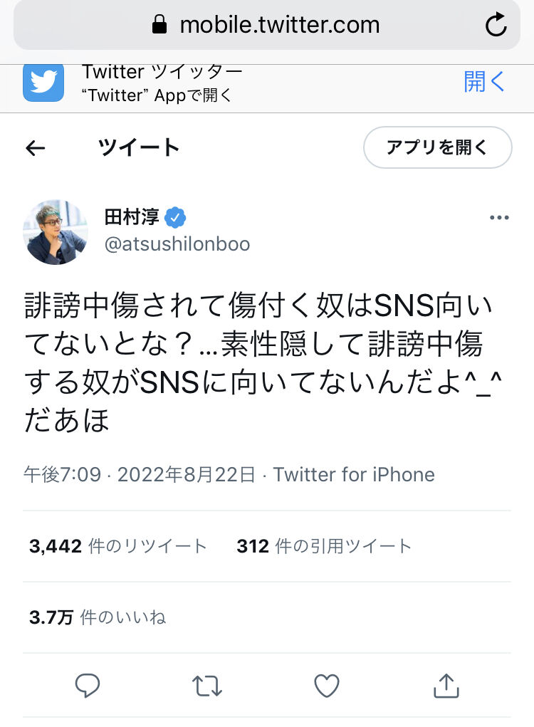 朗報 芸人「誹謗中傷嫌がる人はSNS向いてない?素性隠して誹謗中傷する奴が向いてないんだよドアホ」 2022年09月10日 カテゴリ:芸人まとめ 1: 風吹けば名無し 2022/08/24(水) 16:30:53.58 ID:o2W2s3dq0 7: 風吹けば名無し 2022/08/24(水) 16:36:34.95 ID:9jkJF/mL0 SNSが素性隠れているという風潮 8: 風吹けば名無し 2022/08/24(水) 16:37:46.20 ID:o2W2s3dq0 何で芸人て匿名云々に異常に拘るんやろな 本題から逸れてるやろ 【朗報 芸人「誹謗中傷嫌がる人はSNS向いてない?素性隠して誹謗中傷する奴が向いてないんだよドアホ」】の続きを読む タグ :#ロンブー敦#SNS#誹謗中傷