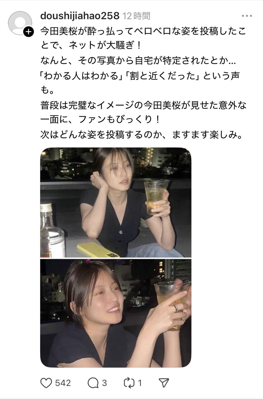 今田美桜、酒ベロベロ姿を公開→自宅特定される 2025年06月04日 カテゴリ:バラエティタレントまとめ 1: それでも動く名無し 2025/06/03(火) 09:52:20.06 ID:FQ5jhOHf0 2: それでも動く名無し 2025/06/03(火) 09:52:41.96 ID:FQ5jhOHf0 人気女優らしく高級マンションらしいで 13: それでも動く名無し 2025/06/03(火) 09:57:48.73 ID:f4Niz2d40 >>2 まあセキュリティがちゃんとしてないとね 【今田美桜、酒ベロベロ姿を公開→自宅特定される】の続きを読む タグ :#今田美桜
